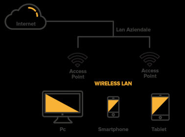 In una rete Wireless i dispositivi devono connettersi a un punto di accesso wired come mostrato nel diagramma seguente, solitamente un Access Point o router wireless, e consente ai dispositivi connessi in modalità wireless di connettersi alla rete Ethernet cablata.