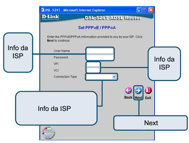 In alcuni casi è necessario modificare il campo Type che definisce il tipo di incapsulamento PPP utilizzato per la connessione e i campi VPI o VCI, inserendo i valori forniti dall’ISP.