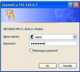 4) Inserire "User e Password" di default del Modem NETGEAR DM111P (l'utente può modificare la password); quelle di default sono "admin" e "password"