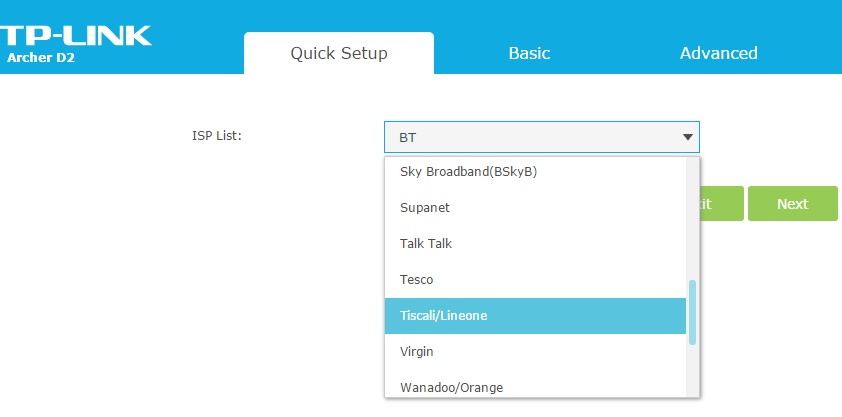 Arriviamo così all'interfaccia grafica del modem. Andiamo in alto e clicchiamo sulla voce Quick Setup e iniziamo la configurazione facilitata: per quanto riguarda la nostra connessione scegliamo nella lista il nostro provider di connessione, per esempio Tiscali, e clicchiamo sul Next per andare avanti;