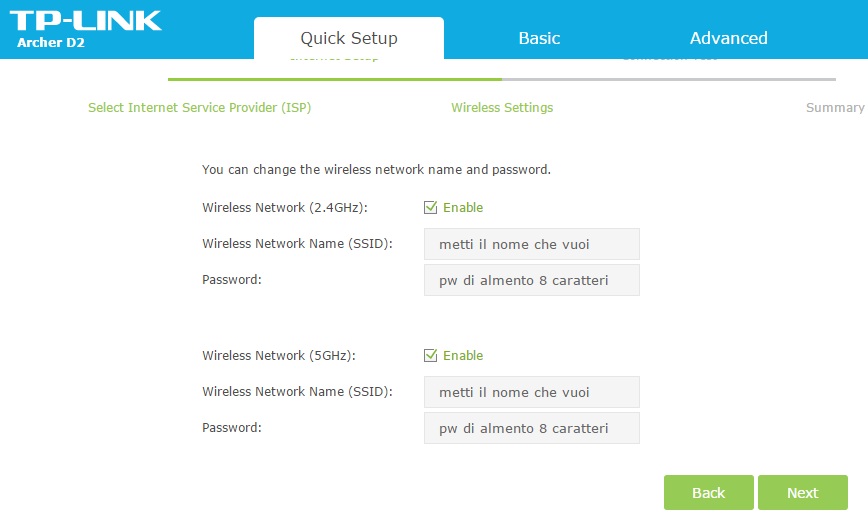 Nel passaggio successivo ci chiede di configurare l'interfaccia wireless che avendo due frequenze (2.4GHz e 5 GHz) si configura in maniera autonoma e separata poichè possiamo fornire a ognuna delle due un nome di rete (SSID) e una password proprio come se avessimo a casa nostra o nel nostro studio due modem wireless differenti. Scegliamo quindi le impostazioni che vogliamo, una password sicura che abbia un minimo di 8 caratteri ma oltre 63 (WPA) e andiamo avanti;