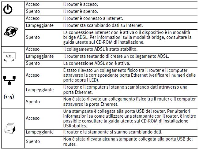 di seguito vengono riportati i significati dei LED e delle porte del U.S.Robotics USR 9107 A