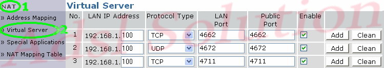 cliccare su VIRTUAL SERVER: in questa sezione, abbastanza intuitiva, possiamo aggiungere (ADD) le porte da aprire sul router Pirelli NetGate VOIP v.2
