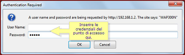 ora visualizzeremo la schermata di login del WAP300N, dovremo inserire User Name e password di accesso. Se è la prima configurazione lasciamo vuoto il campo User Name e mettiamo "admin" come password.